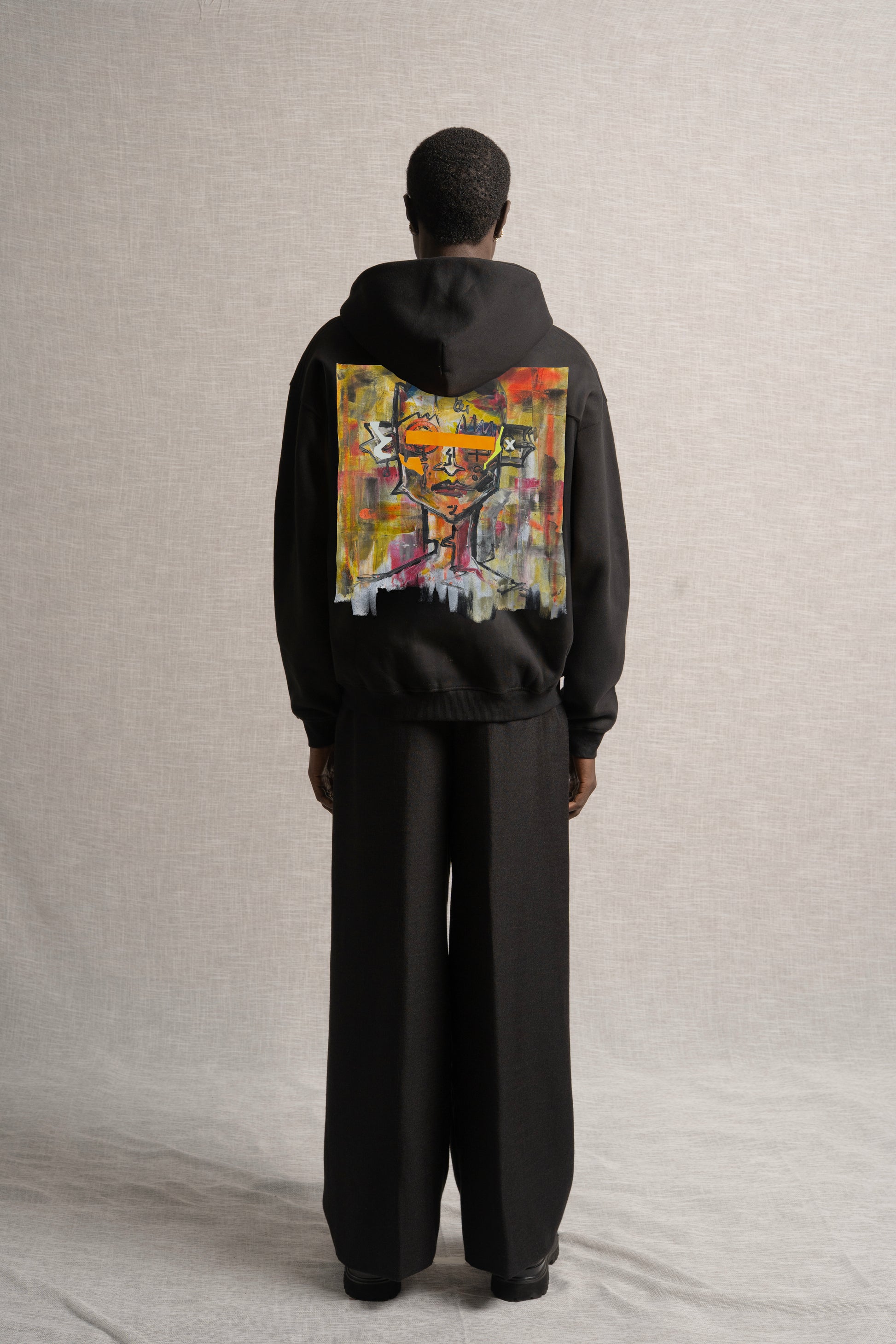 This black unisex vest features hand-painted sleeves and a hand-painted back for a unique artistic touch. It includes a front zipper and an embroidered logo on the front, blending style with functionality.