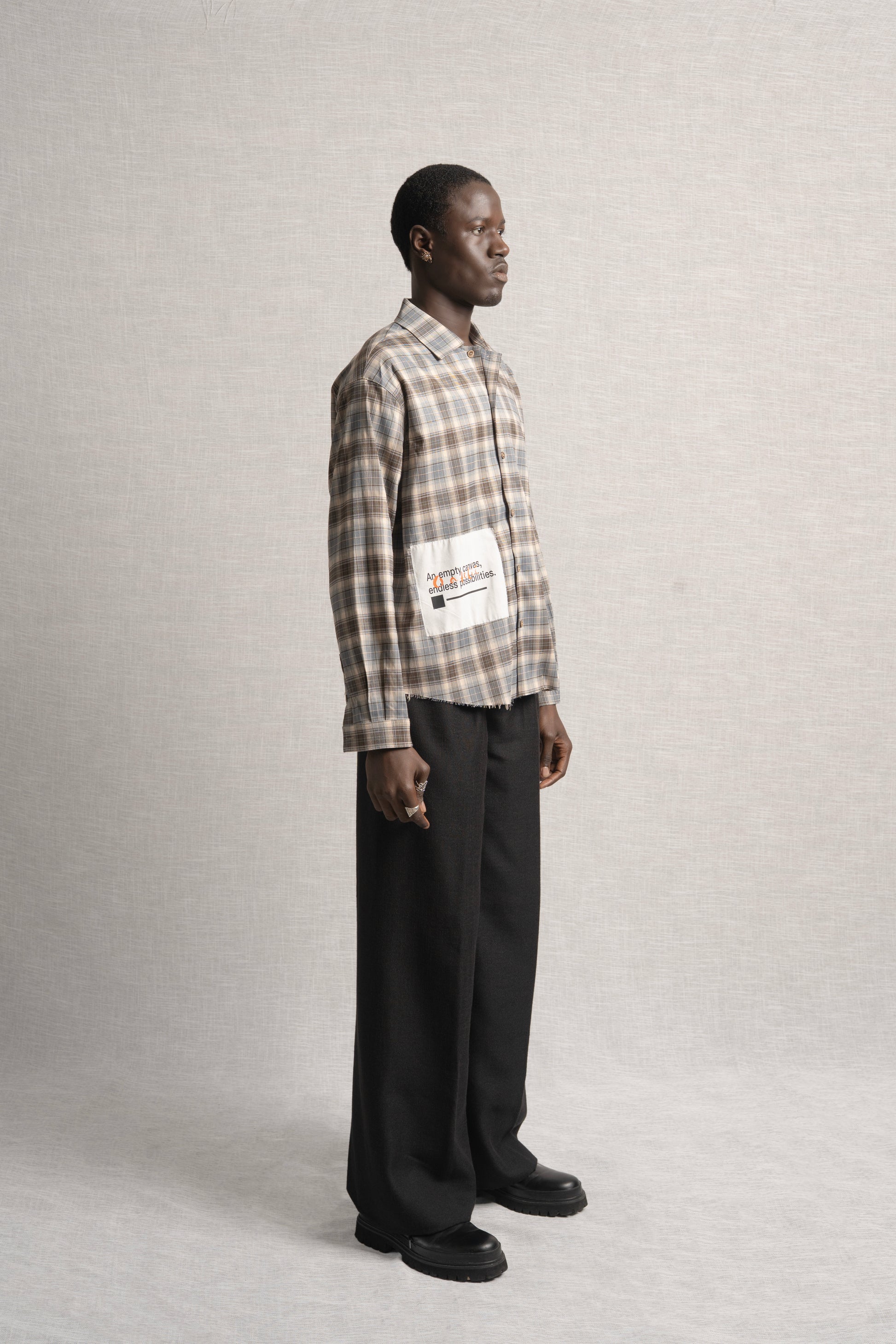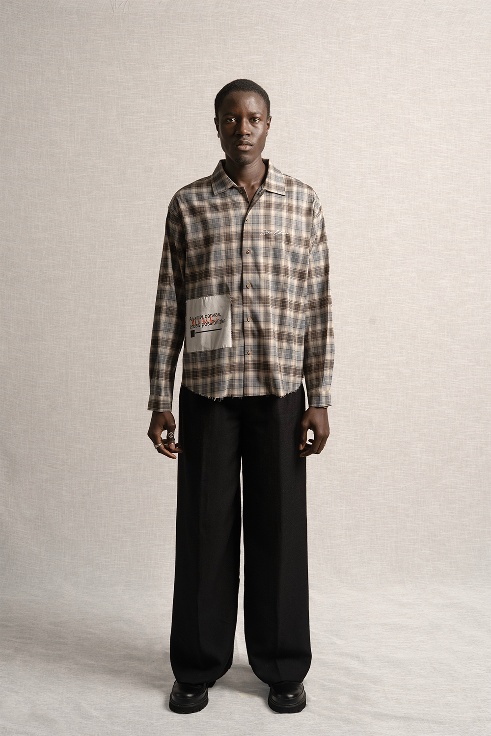 This checkered blouse offers a relaxed unisex fit with a raw, unfinished hem and a subtle frayed effect. Made from 98% polyester and 2% spandex, it features an embroidered front logo and can be worn open or buttoned for versatile styling. Each blouse also has a hand-painted back, making every piece truly one of a kind.