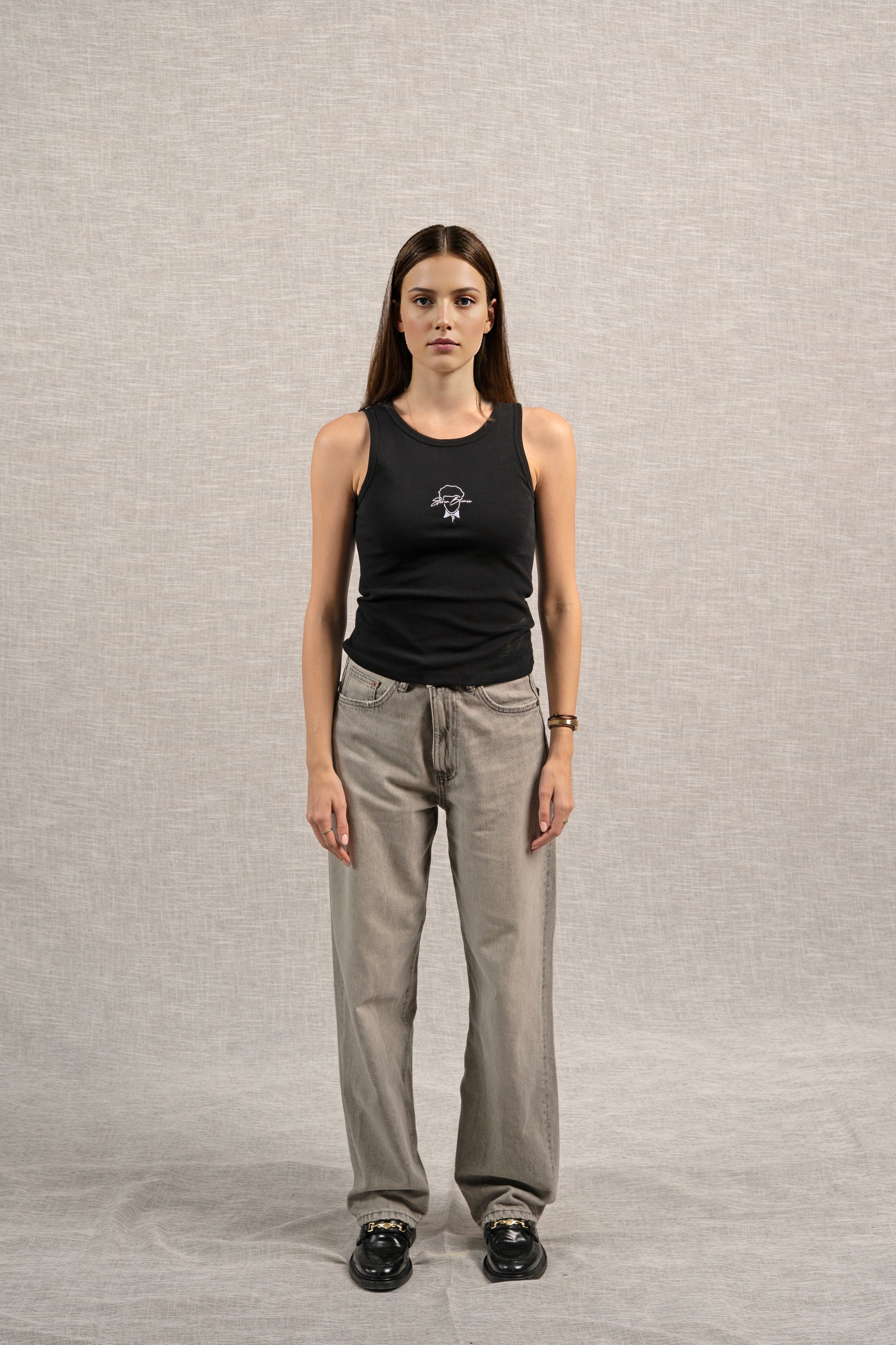 This top is made from a thick fabric and features an embroidered logo at the center. It is designed for a comfortable, fitted silhouette.